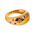 This bold gold band features colorful gemstones and celestial engravings, including a central starburst design, giving it an elegant, cosmic-inspired look.